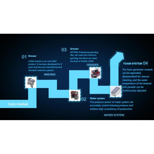 Brown residue box (1), waste water tank (1), drip tray (1), hot water system (1), beverage outlet (1), dispensing cup system (1), touch screen